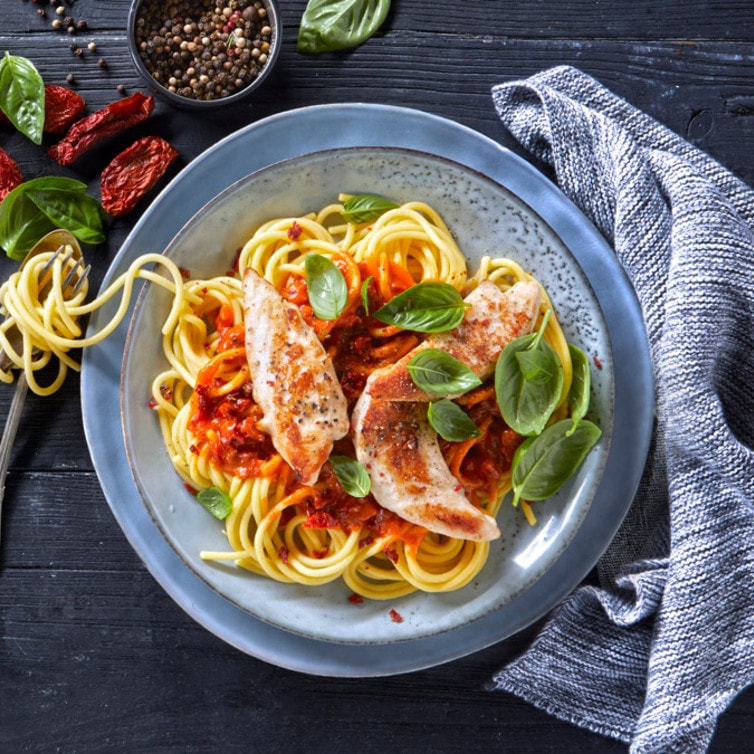 Auf vorgewärmten Tellern anrichten. Die Hähnchenfiletstücke auf die Pasta setzten und mit Basilikum bestreut servieren.