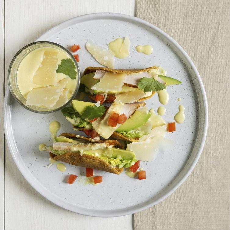 Tacos mit Avocado, knackigem Romanasalat, Parmesandressing und Hähnchenbrust (von Johann Lafer)