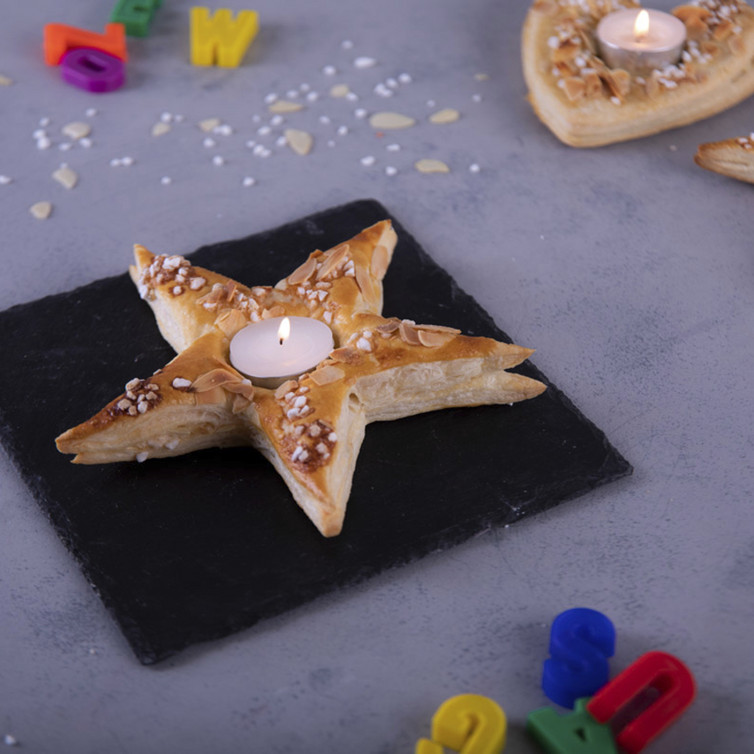 Den Backofen auf 200° C vorheizen. Währenddessen die tiefgefrorenen Blätterteigplatten aus der Verpackung nehmen und einzeln nebeneinander ca. 20-30 Minuten auftauen lassen. Eine Arbeitsplatte leicht bemehlen und 2 aufgetaute Blätterteigplatten bis zur 1 1/2 fachen Größe ausrollen. Mit den Ausstechern oder der Schablone die gewünschten Herzen oder Sterne ausstanzen oder schneiden. Den restlichen Teig beiseitelegen.