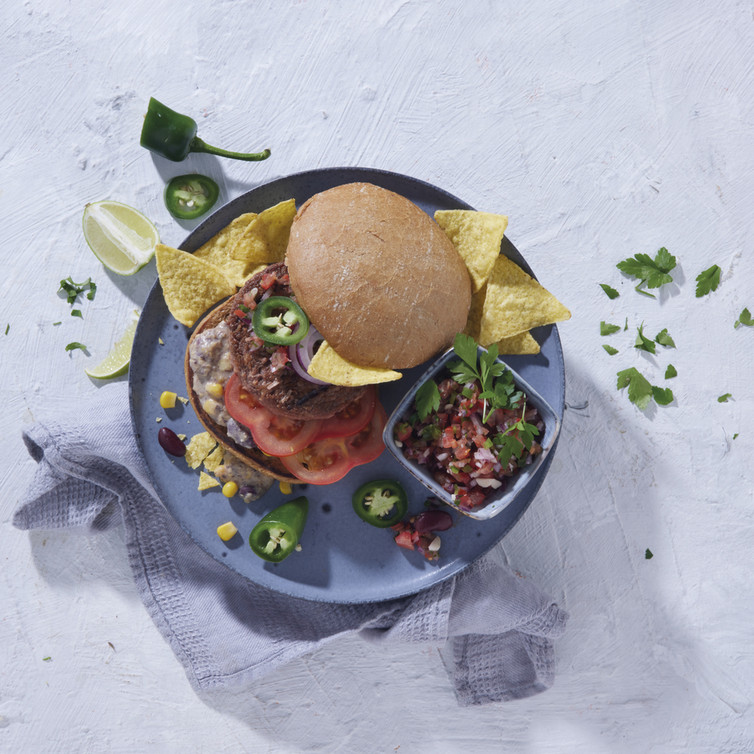 Auf die Unterhälfte der Buns wird die Mais-Kidneymasse und die Tomatenscheiben gegeben, darauf den Burger setzten, dann mit Pico de Gallo Sauce, roten Zwiebelringen, Jalapeños, Nacho-Chips und dem Buns-Deckel bedecken.