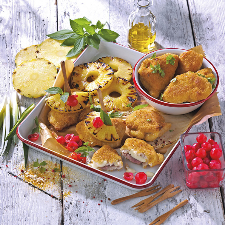 Jeweils eine Belegkirsche und eine Ananashälfte auf ein halbiertes Cordon Bleu Schnitzel legen. Mit dem Tandori Spieß fixieren und anrichten.