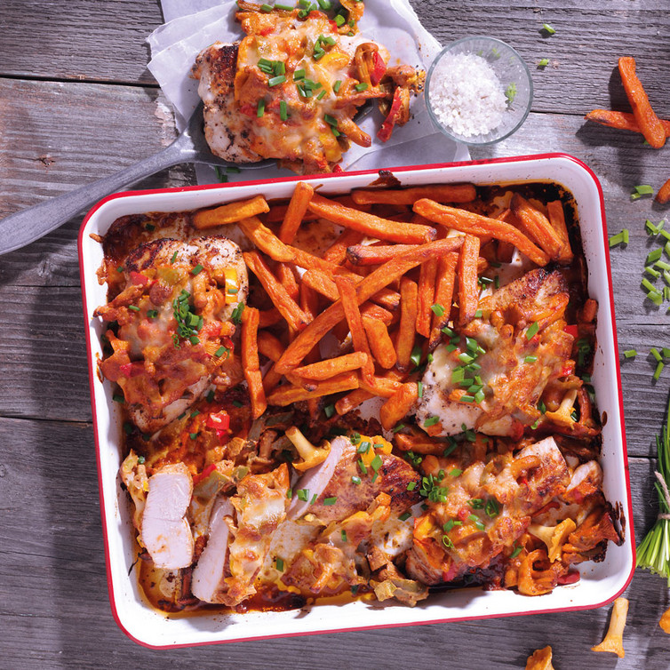Eine Auflaufform auf ein Backrost stellen und die Schnitzel hinein legen. Die Paprika-Pfifferlings-Mischung darauf verteilen und mit Käse bestreuen. Süßkartoffelpommes auf einem separaten, mit Backpapier ausgelegten, Backblech verteilen und mit den Schnitzeln im vorgeheizten Backofen bei 180 °C Umluft ca. 18 - 20 Minuten garen.