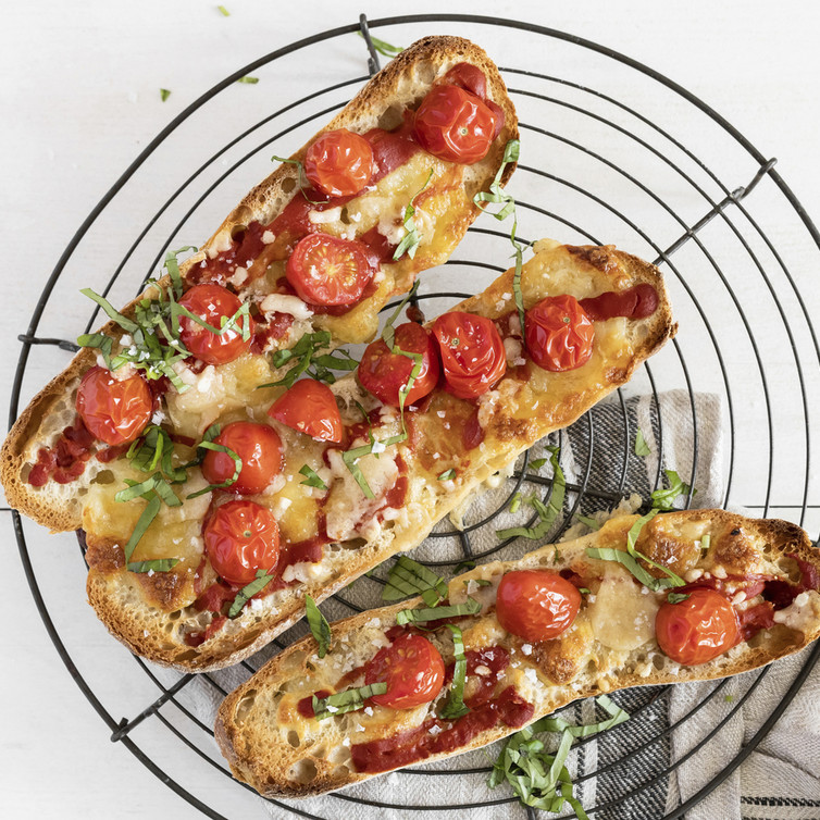 Büffelmozzarella aus der Verpackung nehmen und abtropfen lassen. Käseballen mit Händen locker auseinanderzupfen. Geröstete Baguette mit etwas Olivenöl beträufeln und mit Büffelmozzarella belegen, anschließend 5 Minuten backen. Baguette aus dem Ofen nehmen, Tomatensauce darüber träufeln, mit Tomatenvierteln belegen und geriebenem Parmesan bestreuen. Erneut ca. 5 Minuten überbacken. Mit Salz und Pfeffer bestreuen und mit Basilikumblättern dekorieren.