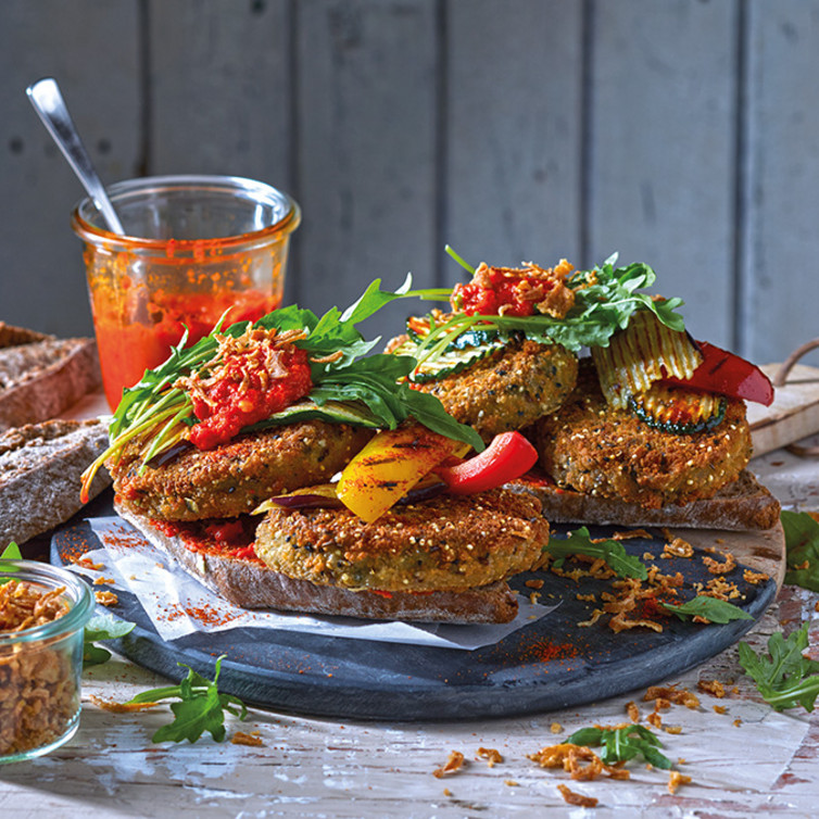 Die Country Brötchen aufschneiden und die untere Hälfte mit 1 EL Ajvar bestreichen. Je 2 Medaillons darauf geben, mit dem Grillgemüse und Rucola belegen. Mit einem Klacks Ajvar und den Röstzwiebeln dekorieren, den Brötchendeckel darauf legen.