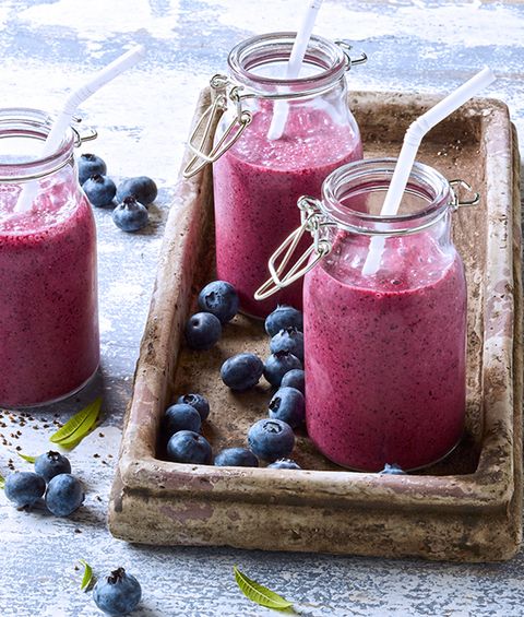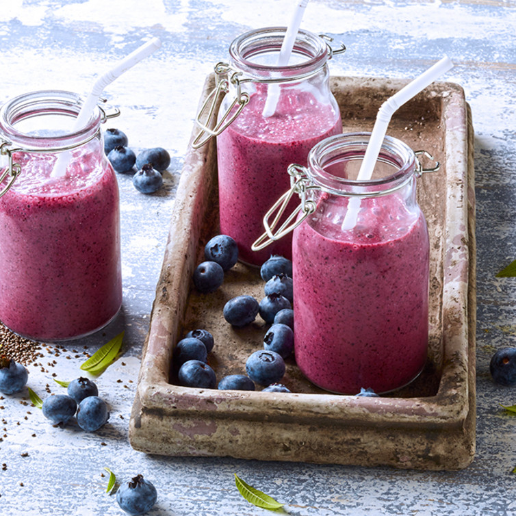 Die Chia-Samen direkt mit der Mandelmilch in den Mixer geben und verrühren. Nun die restlichen Zutaten dazu geben und alles auf höchster Stufe pürieren.