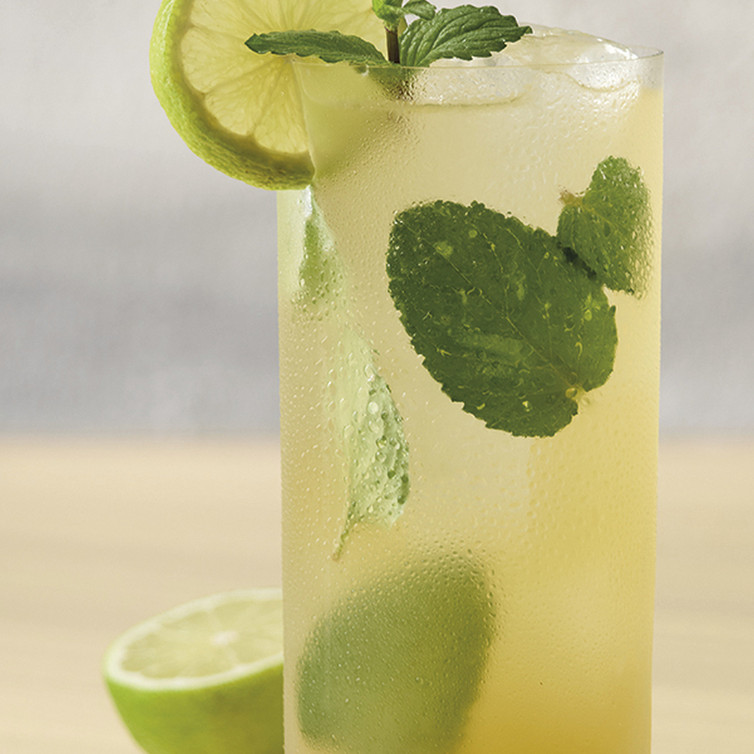Mit einer Limettenscheibe und einem Minzzweig garnieren.