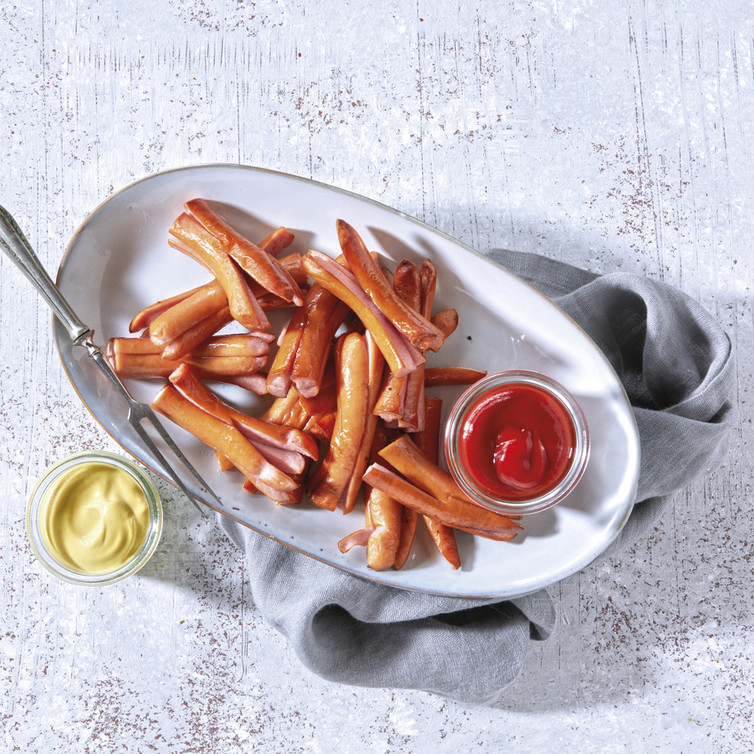Wiener Würstchen etwas antauen lassen und mittig halbieren. Jede Seite zweimal einschneiden, aber Achtung: die Mitte sollte unbeschnitten bleiben.