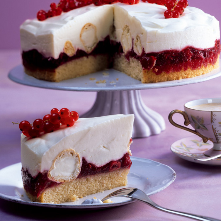 Die Torte mindestens 20 Stunden in den Kühlschrank stellen. Vor dem Servieren mit Früchten belegen und den Tortenrand mit Sahne verzieren.