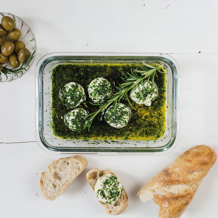 Aus dem Ziegenkäse Bällchen formen und diese leicht in den Chiliwürfeln rollen. In dem Olivenöl einlegen, ggf. noch etwas Olivenöl dazu gießen, damit die Ziegenkäse-Bällchen bedeckt sind.
