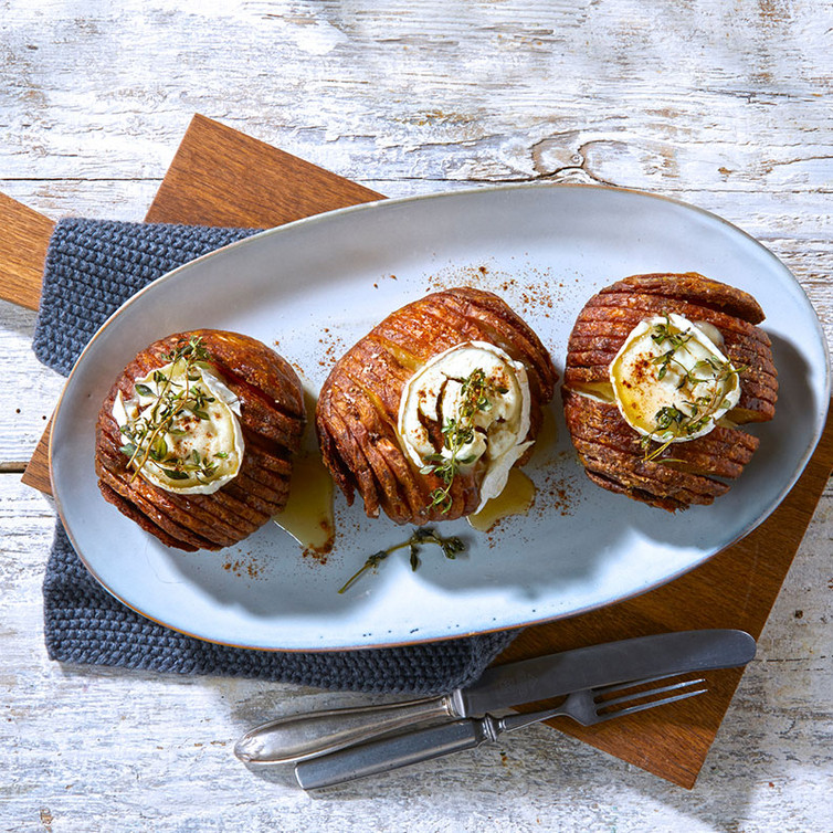 Fächer-Kartoffeln „Hasselback“ mit der eingeschnittenen Seite nach oben in eine Auflaufform legen und im vorgeheizten Backofen bei 180 °C Ober-/Unterhitze (160 °C Umluft) ca. 30 Minuten zubereiten. Ziegenkäserolle in Scheiben schneiden. Thymian waschen.