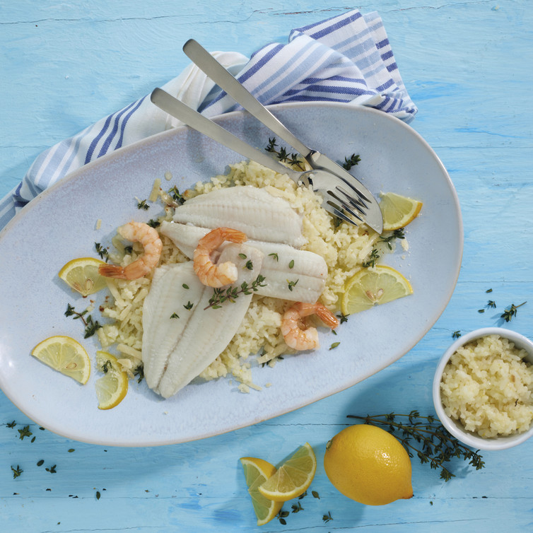 Zitronenrisotto mit pochierter Scholle und Garnelen