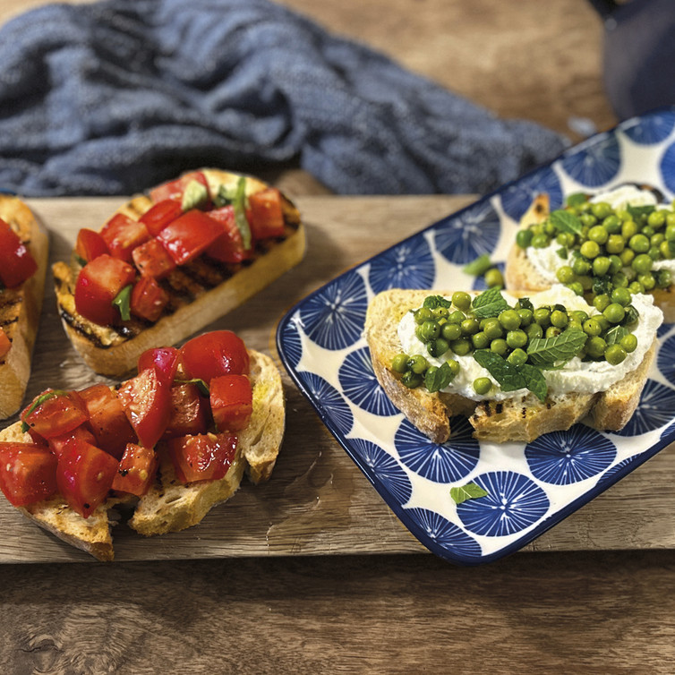 Diese zweierlei Bruschetta sind der Inbegriff mediterraner Leichtigkeit. Knusprig geröstetes BIO-Weizenbrot trifft auf saftige Tomaten, duftendes Basilikum und eine feine Note von Knoblauch – einfach, ehrlich und voller Aroma. Daneben sorgt die Kombination aus süßen Erbsen, frischer Minze und cremigem Ricotta für einen herrlich überraschenden Kontrast. Zwei kleine Happen, die dich direkt nach Italien entführen – unkompliziert, farbenfroh und unwiderstehlich gut.
