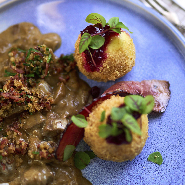 Nach Belieben die Knödel mit einem Kleks Preiselbeerkonfitüre und Blättchen zarter Kresse garnieren.
