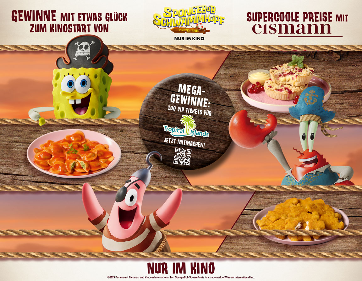 Veranstalter des Gewinnspiels ist die eismann Tiefkühl-Heimservice GmbH, Seibelstr. 36, 40822 Mettmann („eismann“). Im Rahmen der Aktion zum Kinostart von SpongeBob Schwammkopf: Piraten Ahoi! hast Du vom 12.12.2025 bis 15.01.2026 ("Gewinnspielzeitraum") die Chance, folgende Preise zu gewinnen: