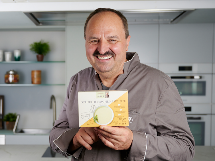 Unter der Marke „Aufgelafert“ zaubert Lafer leckere Gerichte exklusiv für eismann-Kunden. Sein erster Streich: Die „Österreichische Käsesuppe“ mit Bergkäse, cremig-rahmig im Geschmack. Gekocht wird sie nach einem Originalrezept aus dem österreichischen Bundesland Steiermark, der Heimat von Lafer. Daher steckt besonders viel Herzblut und Erfahrung in diesem Rezept, das der Gourmet mit Muskat, Limettensaft und Weißwein verfeinert hat. Zu bestellen im eismann-Onlineshop, tiefgekühlt geliefert und einfach in 25 Minuten im Wasserbad erhitzt für einen zünftigen Abend in den eigenen vier Wänden.